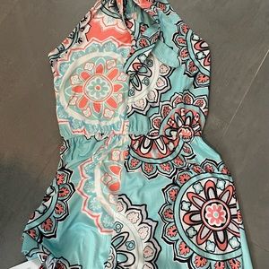 BNWT colorful and adorable romper. Zipper enclosure and tie in the back. Soft cotton material.