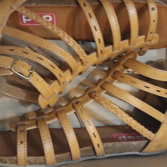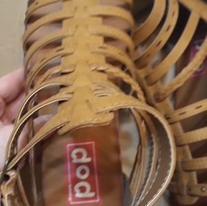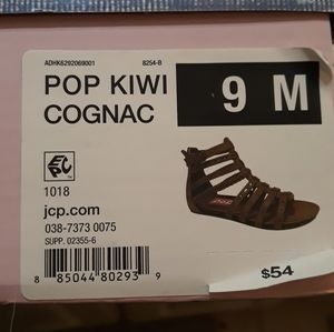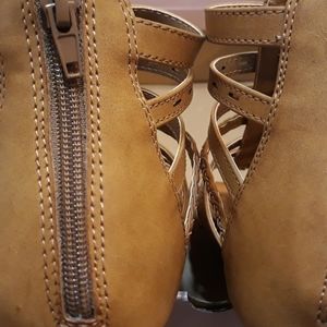 Cognac colored flat sandal zipper back..super cute 1/2 size too big for me. Never worn. Quick purchase to match my daughter that didnt work out size wise. I'm bad at returning items.