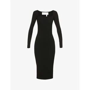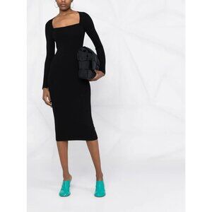 Keywords: minimalist dress, ribbed knit dress, Scandinavian fashion, long sleeve black dress, bodycon knit, midi length dress, square neck dress, sleek evening dress, transitional wardrobe, elevated basics, Remain Birger Christensen dress