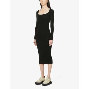 An effortlessly chic knit dress by Remain Birger Christensen. The Jocelyne dress is crafted in a sleek black ribbed knit, designed with a flattering square neckline, long sleeves, and a streamlined silhouette that drapes to a midi length. Perfect for layering or wearing solo, this piece transitions easily from day to evening.
