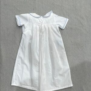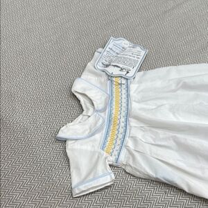 Charming white dress featuring blue and yellow accents. Perfect for special occasions.