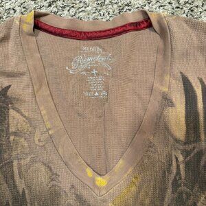Remetee Womens Long Sleeve V-Neck Skull Graphic Top Medium Brown/Gold Printed De