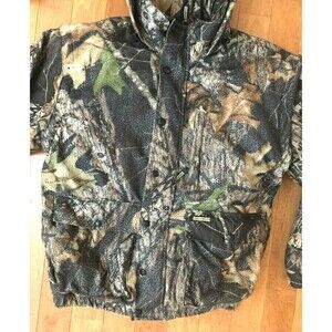 This versatile Remington camouflage hooded jacket is in very nice used condition. It is sized a Medium and the camo pattern is Mossy Oak Break Up.
