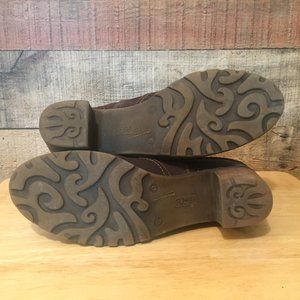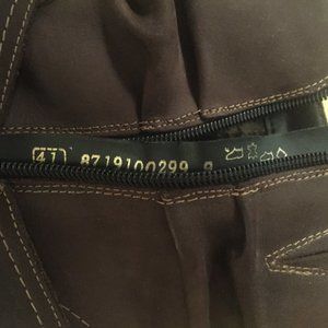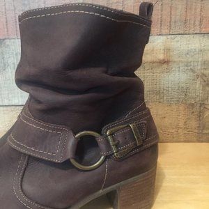 Cool slouchy ankle boot designed for cold weather. Euro Size 41 / US size 10. Rich dark brow nubuck leather with flannel lining for extra warmth. Antiqued brass hardware. 2" substantial stacked heel and rubber sole for good traction. Inside zip closure for easy wear. A little extra wear on back of right heel from driving as shown in photos.