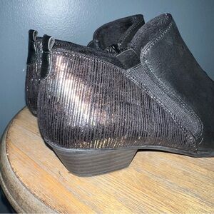 Ankle Booties Upper of Black Leather at Front and Multi-Hued Textured Metallic Material around Ankle. Inside Zipper and Outside Gore. Rubber Grip Sole. Simple Ankle Boot with a Dramatic Effect.
