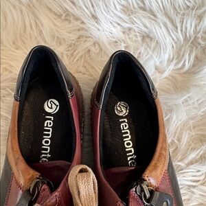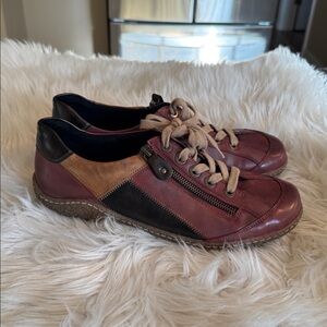 Comfortable red and black shoes with durable soles. Perfect for everyday wear.