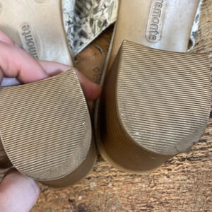 Pre-owned Condition- Flaws - tiny scrape on left heel. Slight bit of drag on the bottom back of both heels that do not affect the balance of the heels. Please see pics for details and for MEASUREMENTS of this item.