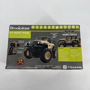 The Remote Control RC Desert Patrol Jeep Armed Forces Rechargeable Vehicle by Brookstone is a beige plastic toy truck designed for off-road operation. It comes ready to go with a remote control, battery, charger, and manual included. The toy vehicle features a military theme, making it ideal for youth audiences who enjoy playing with RC vehicles. With a brush motor and electric power source, this toy grade model offers a fun and engaging experience for unisex children who enjoy remote control trucks.