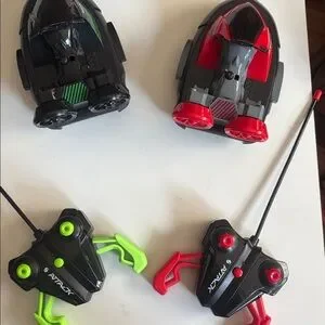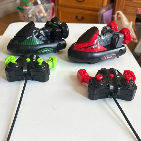 Set of two remote control racing cars with matching controllers. Features vibrant red and green designs.
