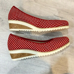Remonte suede red and white polka dot slip on espadrille wedge shoes