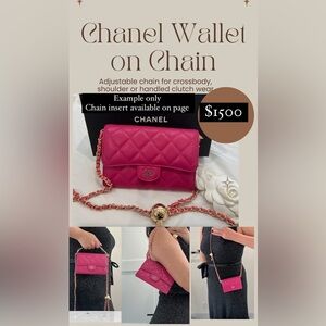 Multiple color and sizes available for wallets on my page. Approx 45” - 47” chains for crossbody. Some are adjustable if showing pearl crush and labeled adjustable. Some include felt insert if shown on wallet listing. Some with removable zipper hook if shown on wallet listing