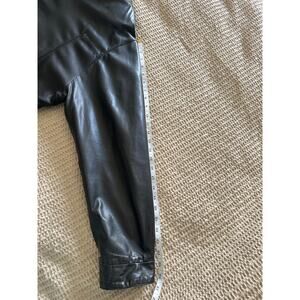 Great condition. There is a tiny pinhole (see last pic) on the back and on one sleeve there are some texture marks (see last few pics). No rips or tears or stains.