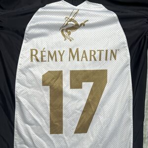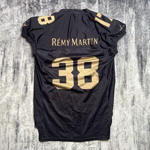 The Remy Martin Cognac Team Cut Football Jersey is a men's size large in white and black colors. It is designed for football enthusiasts and features the iconic Remy Martin brand. The jersey is stylish and sporty, perfect for representing your team on the field or as casual wear.