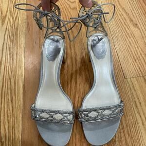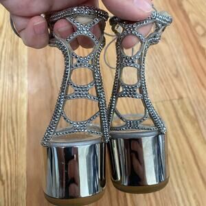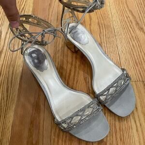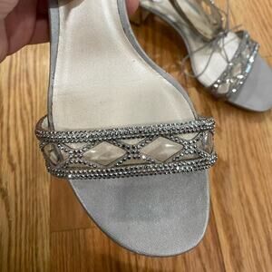 Silver leather sandal with crystal embellishments throughout. Mirrored 1.5 inch heels. Custom Vibram sole added.