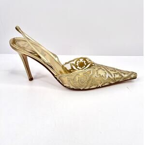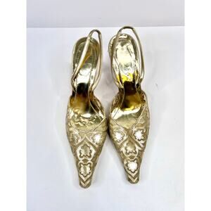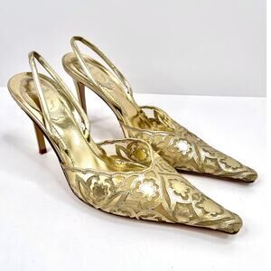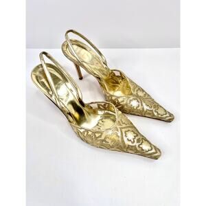 René Caovilla Size 8 Metallic Gold Lace luxury Slingback Stiletto Heels Pointed Pumps
