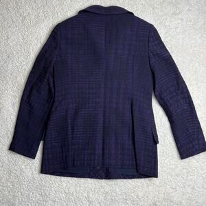 Rena Lange Woven Wool Silk Blend Purple Black Pattern Double Snap Jacket 10. Preowned and in excellent condition. Has deep purple and black coloring. Double buttons and they snap. Very beautiful jacket.