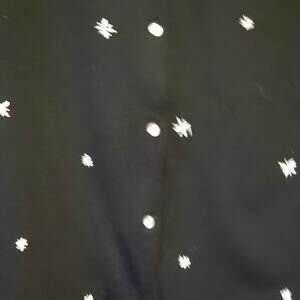 Woman's light weight button front cardigan. The size is large. It is woven with 74% silk and 26% nylon. The color is black. There is a white embroidered design and mother of pearl button accents. 3/4 sleeves. Hem of sleeves and garment have an embroidered pattern. Simple elegance and unique. Chest width 20", length 23", sleeve 18".
