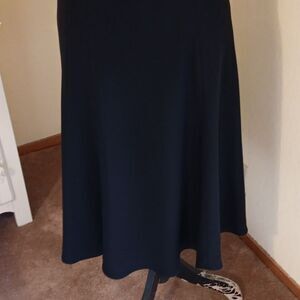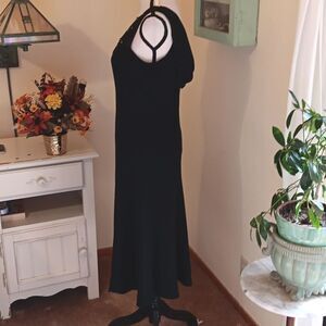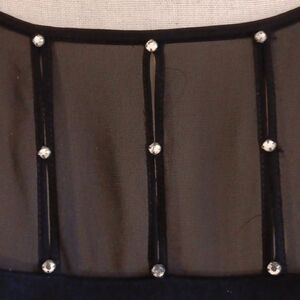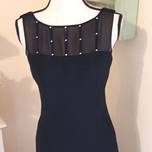 This is a classic. The top of the fitted bodice is sheer illusion stips connected by set rhinestones. The curved back has a sheer drape. Pull over. Bra friendly straps. Fit and flare shape. Crepe-like fabric. Size 6 measures 38 at chest, 34 at waist, 48 at hips. 42.5 long from shoulder to hem. This beauty will be your favorite.