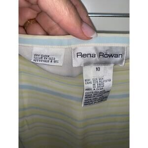 Keywords: Rena Rowan, yellow outfit, women's clothing, large size, regular fit, skirt and top set, 2 piece set, nylon spandex blend, rayon nylon blend, casual wear, elegant design, pastel stripes, comfortable fit, stylish outfit, dry clean only, pre-owned condition.