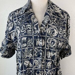 Stylish and fun print on this button down shirt by Rena Rowen in excellent preowned condition. It measures 22 inches armpit to armpit laying flat and 32 inches in length from shoulder to hem.