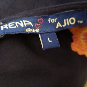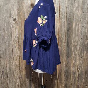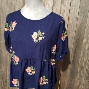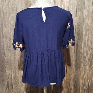 Rena for Ajio L Women's Top Blouse Baby Doll Peplum Blue Embroidered Floral