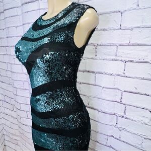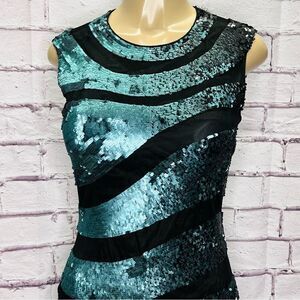Fully lined with a Sheer sequin overlay. Measurements are flat and approximate. Zip up back.