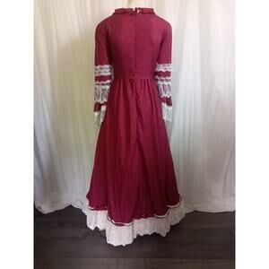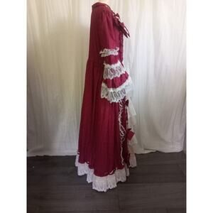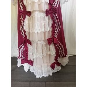 Gorgeous Long Ball Gown with a Wide Sweep, Gently Elasticized Waist, Stretchy Burgundy and Red Merlot Paisley Print Fabric Embellished with Pale Pink Ruffles, White Lace, 3/4 Bell Sleeves, Pretty Bow Detail and Back Zipper. Lovely Victorian Gown, Renaissance Costume, Theater Performance, or Princess, Lolita, Cosplay, Hamilton Theme Party or a Romantic Evening at Home. Tag Size: Small. Measurements: Chest 36", Waist 30" - 36". New Without Tags. Never Worn. Smoke Free Home.
