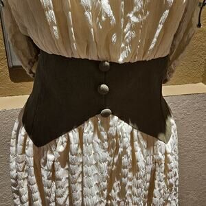 Step into another era with this Renaissance-inspired cosplay dress. Features an off-shoulder cream tiered skirt, puff sleeves, and an olive corset waist detail with button front. Perfect for Renaissance fairs, cottagecore styling, fairycore fashion, cosplay events, theater, or Halloween costumes.