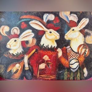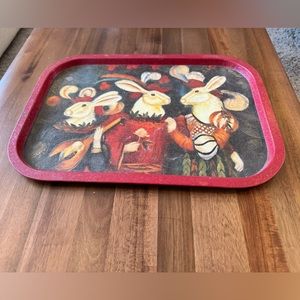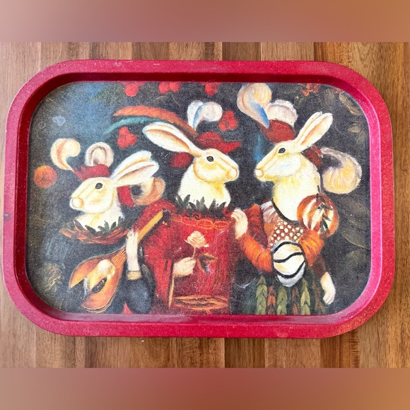 Really cool vintage metal serving tray featuring renaissance rabbits in costume. In great vintage condition with some scratches on edges from wear. Great display piece for Easter or anytime.