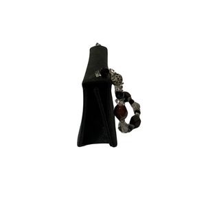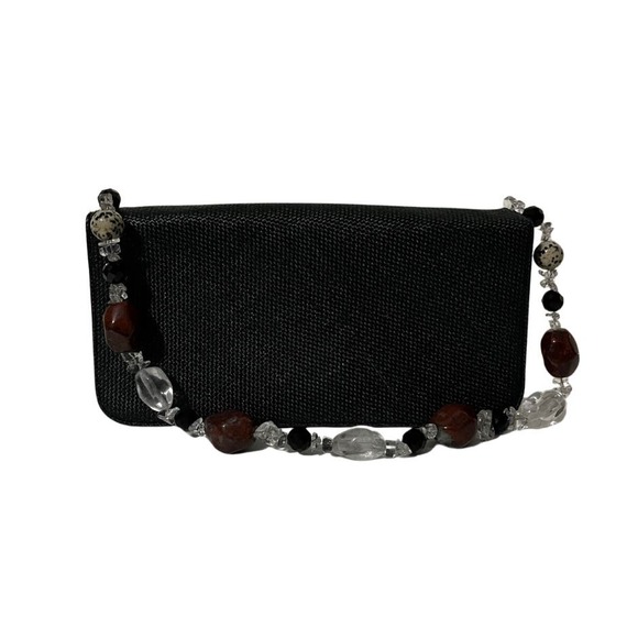 Elegant black shoulder bag. Features a unique beaded strap, with genuine raw cut stones. Perfect for evening outings.