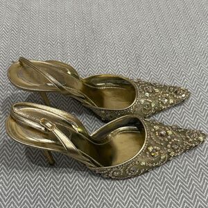 Rene Caovilla Elegant Gold Embellished Women's Pointed Sling Back Heels Size 37