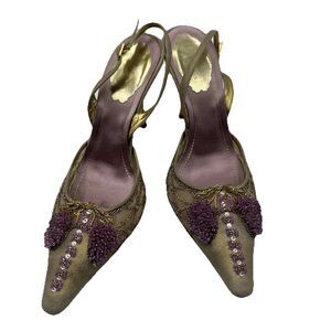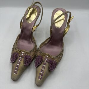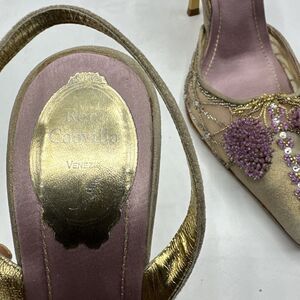 Rene Caovilla Gold Metallic Pink Beaded Leather Heels Slingbacks Sz 7