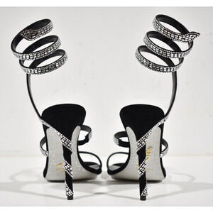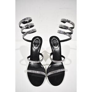 Rene Caovilla Margot Black Silver Crystal Ankle Wrap Strap Sandal Heel Pump 36.5