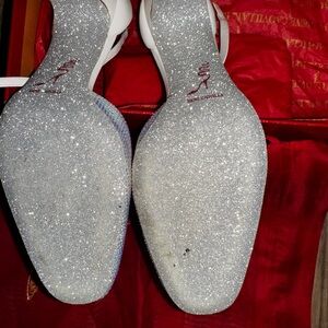 Elevate your style with these exquisite Rene Caovilla heels, featuring a shimmering silver hue and a sophisticated ankle strap design. The glittery finish adds a touch of glamour, making them perfect for weddings or formal events. Experience the perfect blend of elegance and contemporary fashion with these stunning shoes.