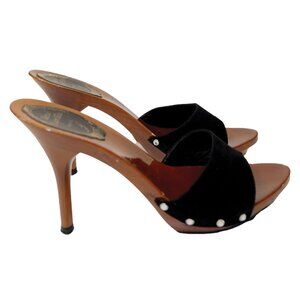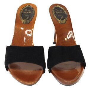 Rene Caovilla black suede wooden platform sandals with Swarovski crystal embellishment.