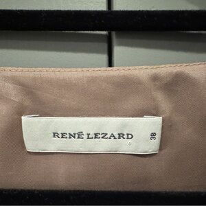 This elegant bronzy taupe Rene Lezard dress features a flattering V-neck and short sleeves, perfect for any occasion. Rene Lezard is a German label known for its quality and detail. The gathered waist and front and back detailing adds a touch of sophistication. Has side zipper and pockets. 65% cotton and 35% silk. In good condition.