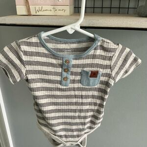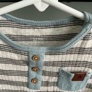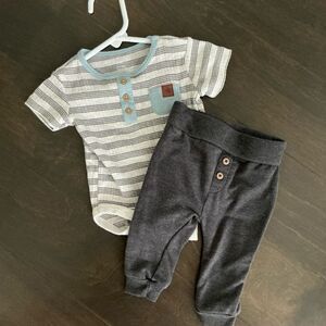 Charming blue striped onesie with button accents. Paired with cozy charcoal pants. Ideal for a trendy baby look. Size 3-6 months. GUC shows signs of wash wear, but always washed on delicate and hung to dry.