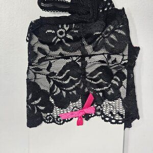 Ultra-sexy crotchless black lace side-tie boyleg with contrast pink trim. Satin bows on side-tie ribbons and center front