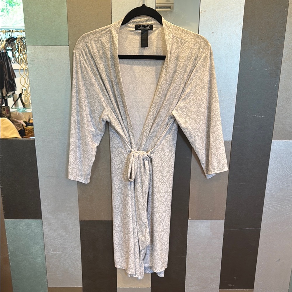 Indulge in the luxurious comfort of the Rene Rofe gray and white robe, designed with a classic wrap style. This robe is perfect for lounging, offering a soft and inviting feel that makes it a must-have in your sleepwear collection.
