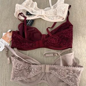 Chic lace bras in cream, burgundy, and taupe. Offers style and comfort. Perfect for any occasion.