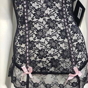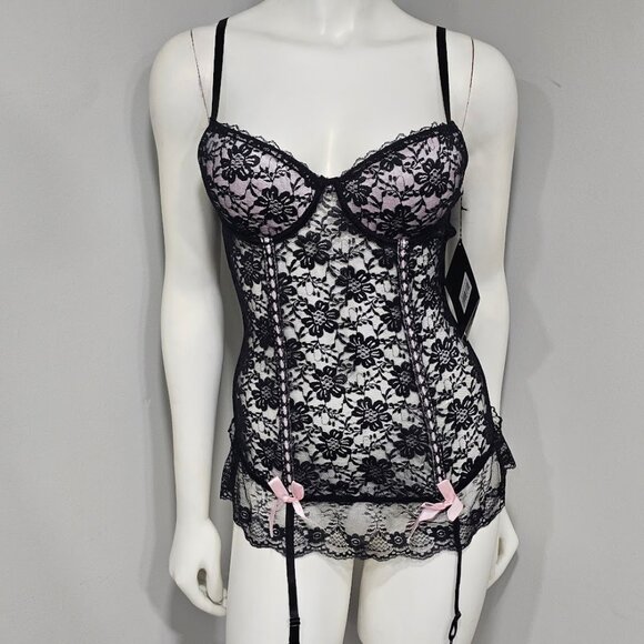 Black floral lace bustier from Rene Rofe Lingerie, featuring an underwire push-up bra, boning, and garter straps.It has pink bows as accents. Adjustable Strap and garters.