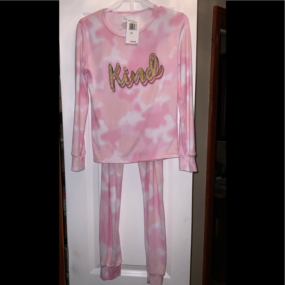 Long sleeve top with KIND across front in gold sparkle and bright pink trim .. bottoms are same pattern color as top with elastic waist