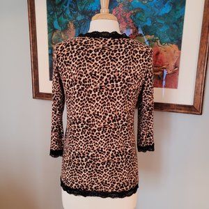 Tan Brown and black Leopard print. V Neck, 3/4 length sleeves.