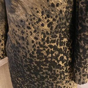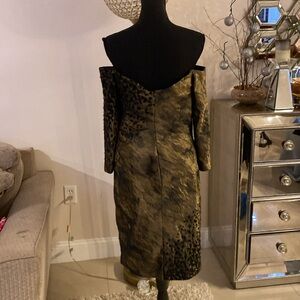 This exquisite Rene Ruiz dress showcases a captivating off-the-shoulder neckline and long sleeves, perfect for a cocktail night out. The black and gold palette is adorned with intricate embellishments, creating a luxurious and sophisticated look. Its sheath silhouette ensures a flattering fit, making it an elegant choice for any evening affair.