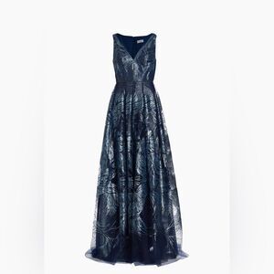 Vibrant fit-and-flare gown adorned with metallic jacquard in a feather motif, showcases deep V-neck, banded waist, and tulle skirt overlay.