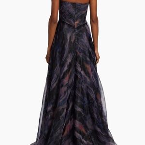 Crafted of printed organza, this strapless gown by the Rene Ruiz Collection is detailed with a pleated bustier bodice and a draped A-line skirt.