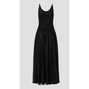 In excellent pre-owned condition with no visible flaws. This Rene Ruiz Collection gown features hand-draped black charmeuse in a flattering A-line silhouette. Designed with a scoop neckline, sleeveless bodice, back zipper closure, and a 28" slit for ease of movement. Measures approximately 58" from shoulder to hemline. Elegant and timeless—perfect for formal events, galas, weddings, and black-tie occasions.
