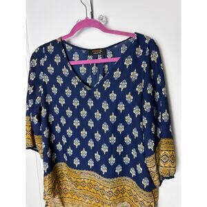 Excellent condition - no snags, holes, or stains. Classic, boho chic blouse. Navy blue and gold block print design. V-neck neckline. Slightly oversized with a puff sleeve. Chic blouse. Smoke free pet friendly home. All offers are welcome.