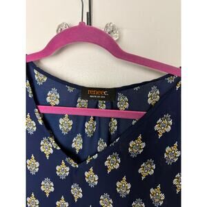 Renee C Block Print Flowy Blouse Women's Small Navy Blue Gold V-neck Top Shirt