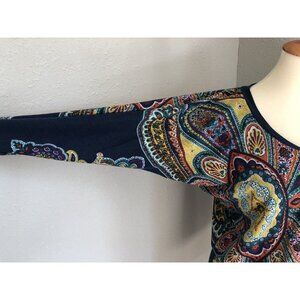 This mini dress is so flattering with it's elastic waist and dolman sleeves in a beautiful jewel tone pattern.